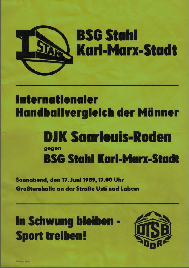 Der Wunsch der DJK Roden auf einen baldigen Gegenbesuch in Karl-Marx-Stadt sollte sich aber trotz Anfragen in den Jahren 1987 und 88 erst vom 15.-18. Juni 1989 verwirklichen, also noch vor dem Fall der Grenz-Mauer. Nach langer Fahrt und einer intensiven Grenzkontrolle wurde unsere 20-köpfige Delegation vor dem Congress-Hotel von den Herren Wittig, Örtl und Kallweit empfangen. Jeder DJK-Sportler erhielt nach der Einweisung in das Hotel noch 100 Ostmark als Taschengeld für die vier Tage Aufenthalt.
