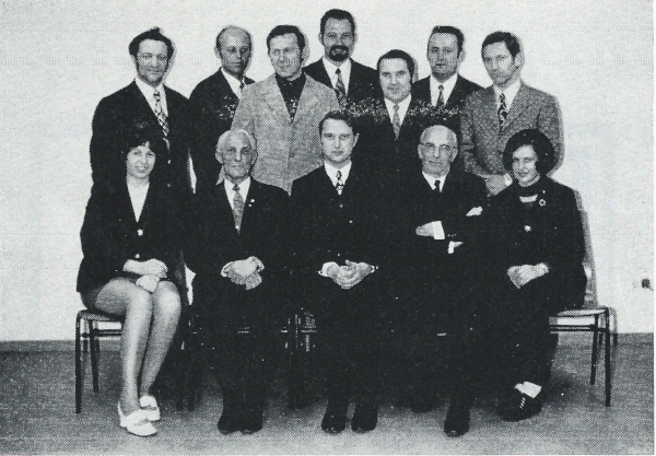 Der Vorstand im Jubiläumsjahr. Stehend (von links): Hein, Gerath, Gergen, Lubjuhn Hermann, Recktenwald, Lay, Hiry. - Sitzend (von links): Mathieu, Lubjuhn Otto, Kaplan Franziskus, Görg, Lubjuhn Cäcilia.