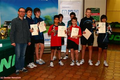 36.DKT Schüler B - Leon Roskothen setzt sich durchAllerdings nur knapp, denn das Endspiel ging über fünf Sätze und Lennart Schlender, selbst erst mit größter Mühe ins Finale gekommen, hielt das Spiel jederzeit offen.Nicht nur im Finale, sondern schon in den acht Gruppen war ordentlich Betrieb, wobei alle Gesetzten auch die Hauptrunde erreichten. In der ersten Runde kamen alle Gruppenersten auch eine Runde weiter, was selten genug vorkommt. Auch danach setzte es sich fast so fort, kamen doch mit einer Ausnahme stets die höher gesetzten Spieler weiter. Bei der Ausnahme wo Robin Bell Robin Wiesen unterlag, handelte es sich um die 4 und 5 der Setzliste, was dann auch keine große Überraschung war. Simon Klasen bereitete Lennart wieder einmal große Mühe und deutete an, dass er über großes Talent verfügt und nach wie vor jedem gefährlich werden kann. Leon Roskothen, mit Auftaktschwierigkeiten gegen Alexander Dietrich in der ersten Runde, musste auch gegen Robin Wiesen im Halbfinale schwer ackern, um in vier Sätzen siegreich von der Platte zu gehen. Noch weit enger ging es zwischen Nico Eichten und Lennart zu. Nachdem Nico eine Zwei-Satz-Führung nicht nutzen konnte, ging der fünfte Satz in die Verlängerung und endete erst bei 16:14. Lennart ging im Endspiel im dritten Spiel in Folge über die komplette Distanz, dort hatte dann aber Leon am Ende den besseren Ausgang für sich.