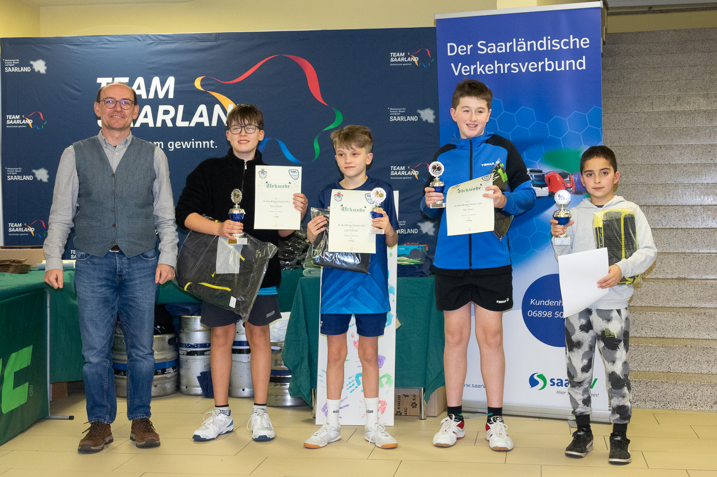 Nicht so viele Spieler konnten den saarVV-Cup in ihrer Karriere zweimal gewinnen. Pascal Naumann, Daniel Gissel und Til Sander war das bisher vorbehalten. Mit Arman Aghababa und Sebastian Sonnenburg gesellen sich nun schon zwei weitere dazu in diesen Ehrenkreis und mit Blick auf die Geburtsjahrgänge könnte Sebastian gar zum Sieger mit den meisten Titel emporsteigen in den nächsten Jahren. Er hat die Chance auf ein echtes Alleinstellungsmerkmal im Wettbewerb und wir werden seine weiteren Versuche dazu und auch die der Jäger, um eben dies in den kommenden Jahren zu verhindern und selbst ganz oben auf dem Treppchen zu stehen, sehr interessiert verfolgen.Ein 32er KO-Feld war die Grundlage allen Schaffens bei der nunmehr schon 17. Auflage einer Partnerschaft mit dem saarVV, von der wir anfangs sofort Feuer und Flamme waren und in die wir in den fast zwei Dekaden aber auch selbst einiges zurückgegeben haben. Dank sei gesagt den Kümmerern dieser nützlichen Symbiose. Während die späteren Sieger Arman und Sebastian durch die Konkurrenz durchmarschierten, nach einem Freilos in Runde 1 folgten drei starke Siege bis zum Finale, auch im Halbfinale konnten Cheyenne Ney und Jolina Becker (TTV Altenwald/DJK Ottweiler) die beiden nicht aufhalten, so führte in der unteren Hälfte das Tableau Johanna Schmidt und Björn Müller (TuS Wörschweiler) nach schon grösseren Mühen ebenso ins Halbfinale wie Niklas Reuter und Felix Meder vom SV Trier-Olewig. Doch mehr als einen deutlichen Erfolg der Rheinländer im Halbfinale über das Mixed-Doppel des TuS Wörschweiler und der damit verbundene Titel des Vize-saarVVCup-Siegers war im Wettbewerb nicht drin, zu dominant waren die späteren Sieger Arman und Sebastian dann im Finale, das sie in drei klaren und eindeutigen Sätzen gewannen. Für alle Beteiligten bis hin zu den 5.Platzierten lohnt sich der saarVV-Cup aber, denn die Ehrung der jungen Sportlerinnen und Sportler findet hier immer im grossen Kreis statt und kaum ein Beteiligter verlässt das Turnier ohne einen ordentlichen Preis bei der Siegerehrung erhalten zu haben, traditionell für die Mädchen und Jungen der Altersklasse U19 dominieren hier Preise aus der Medien- und Unterhaltungsbranche und stossen sofort beim Überreichen auf ordentlich Gegenliebe. Platzierungen 1. Arman Aghababa / Sebastian Sonnenburg (TTSV DJK Bous / TTV Reisbach) 2. Niklas Reuter / Felix Meder (SV Trier-Olewig) 3. Cheyenne Ney / Jolina Becker (TTC Altenwald / DJK TT Ottweiler) 3. Johanna Schmidt / Björn Müller (TuS 05 Wörschweiler) Ergebnisseite des 17. saarVV-Cup beim 46.Drei-Königs-Turnier Finale des 17. saarVV-Cup im Youtube-Channel der DJK Roden Abt.TT 46. DKT Nachlese - Schülerinnen und Schüler U13Spannendes und spielstarkes Finale mit Siegchancen auf beiden Seiten