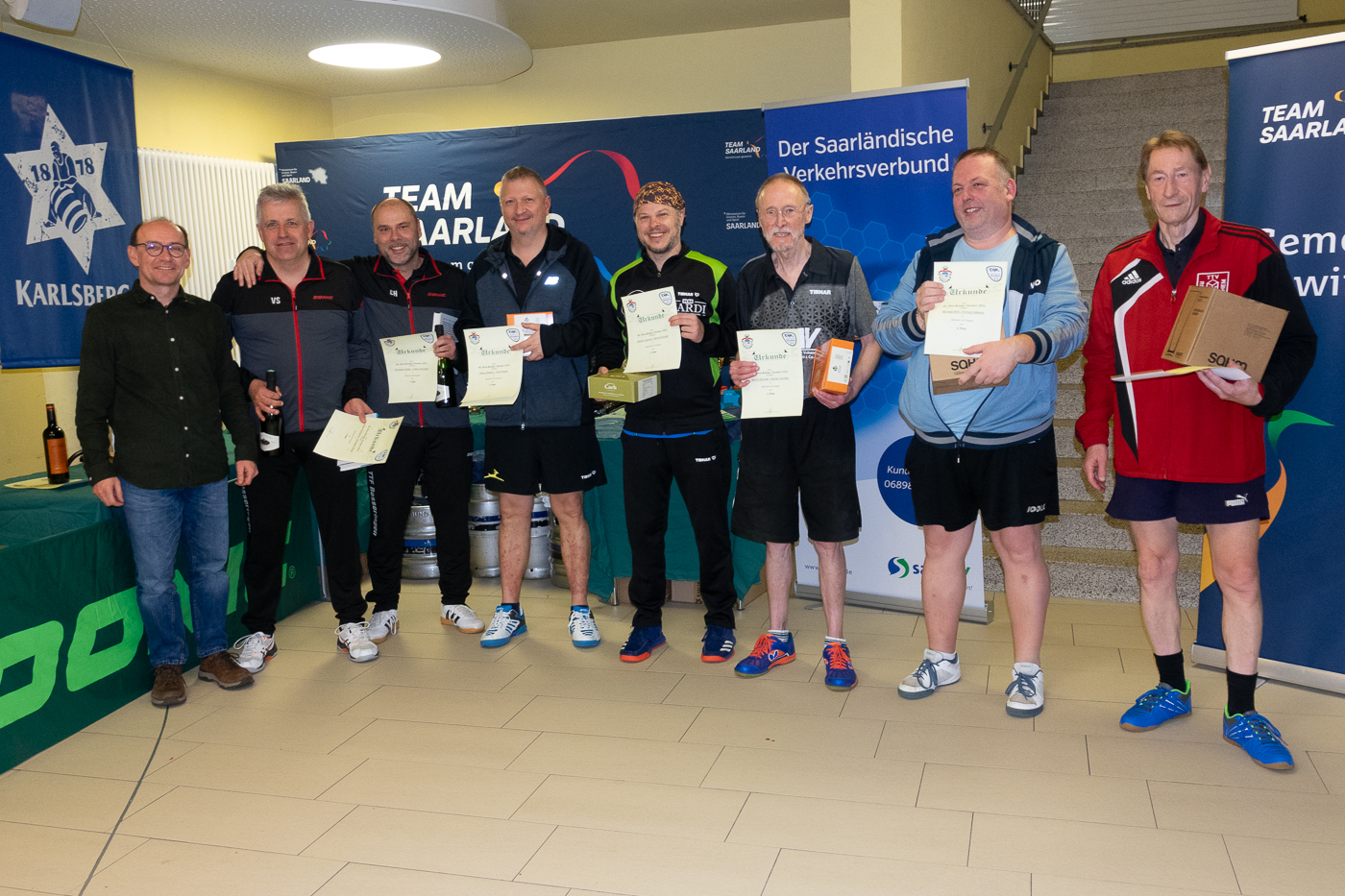 Unser Team-Wettbewerb ist eine schöne Zusammenführung der Hobby-Spieler mit jeweils einem Aktiven. Spielfreude kann sich verdoppeln, Stress halbieren. Waren wir im ersten Jahr der Durchführung noch etwas übervorsichtig und schrieben die Turnierzettel von Hand, so schreitet die Integration der Hobbyspieler mit der zweiten Auflage auch EDV-technisch weiter voran und wir konnten den gesamten Wettbewerb -wenngleich mit Mühen- in der Tunriersoftware MKTT abbilden. Das hilft im Turnierablauf, weil man dadurch einen zeitlichen Überblick über diese Konkurrenz behält, die ja viele Tische und Wettkampfzeit bindet, es hilft aber auch bei der Dokumentation im Nachhinein und so geht uns auch nicht verloren, was sich da in dier Saarlouiser Stadtgartenhalle am Freitag Abend parallel zu den Senioren abgespielt hat.Es gab ein reines Hobby-Team, der zweifache Einzelmeister der Hobby-Spieler war auch dabei, bei manchem Team war der Unterschied gar nicht so groß, bei anderen hingegen spielten Oberliga-Akteure die Hauptrolle. Geschwister spielten zusammen, Freunde, so wurde eine harmonische Veranstaltung daraus. Es war also bunt gemischt und so manch einer hatte seinen Spaß daran, sich auch einmal mit einem Klassespieler in Einzel und Doppel zu messen.