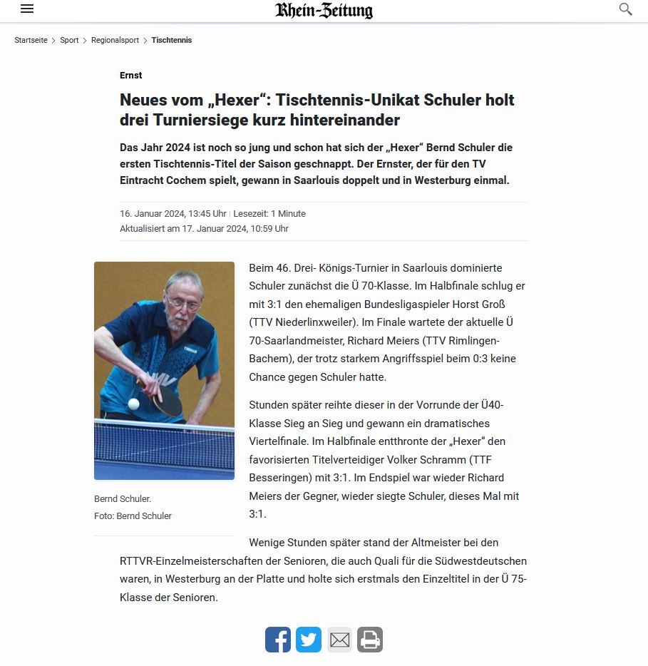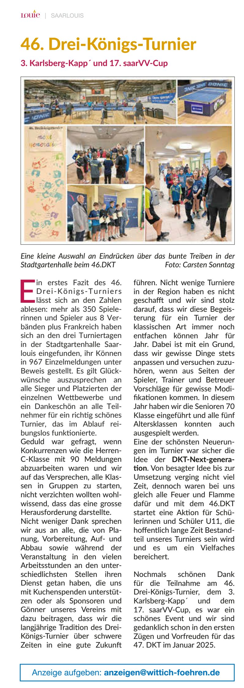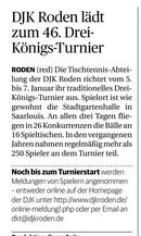 Presseberichte zum 46.Drei-Königs-TurnierLouie - das Amtliche Magazin der Kreisstadt Saarlouis im Wittich-Verlag berichtet vom 46.DKT![]() Die Rheinzeitung berichtet von Bernd Schulers Erfolgen beim Drei-Königs-Turnier ![]() Die Saarbrücker Zeitung berichtet im Saarlouiser Lokalteil am 10. Januar 2024 ![]() Die Saarbrücker Zeitung berichtet im Saarlouiser Lokalteil am 22. Dezember 2023 ![]() Der Wochenspiegel schreibt in der Ausgabe vom 30. Dezember 2023 ![]() Saarlouis. Die Tischtennisabteilung der DJK Saarlouis-Roden e.V. richtet vom 5. bis 7. Januar 2024 das traditionelle Drei-Königs-Turnier in seiner 46. Auflage aus. Spielort ist wie gewohnt die Stadtgartenhalle in Saarlouis. An allen drei Tagen fliegen in 26 Konkurrenzen die Bälle an 16 Spieltischen nahezu pausenlos und die DJK Roden lädt neben den sicher zahlreich meldenden Tischtennis-Cracks aus der Region alle Interessierte als Besucher gerne dazu ein, der Eintritt ist frei und für Verpflegung bestens gesorgt. Wenn sich die Turnierraster so füllen wie die vergangenen Jahre, dann werden über 250 Spieler rund 800 Meldungen abgeben und von Freitag Nachmittag bis zum späten Sonntag Abend wird fast ohne Stop gespielt. Auf der Homepage www.djkroden.de gibt es zum Turnier eine eigene Rubrik, die Ergebnisse werden während der Veranstaltung live getickert und alle Finals im Youtube-Channel des Vereins zeitnah eingestellt. Noch bis zum Turnierstart werden Meldungen zum Turnier angenommen, es gibt dazu auf der Vereins-Homepage die Möglichkeit der Onlinemeldung und einen Meldetracker, der alle eingehenden Starts anzeigt, Meldungen per Email an dkt@djkroden.de sind natürlich ebenso möglich und erwünscht. Zeitplan und einzelne WettbewerbeFreitag, 05. Januar 202417.00 Uhr Senioren Ü50, Senioren Ü60, Senioren Ü65, Senioren Ü70, Seniorinnen Einzel, Kombi-2er- 18.30 Uhr Senioren Doppelkonkurrenz 19.30 Uhr Senioren Ü40, Hobby-Einzel-Turnier Bei den parallel beginnenden Konkurrenzen Ü50, Ü60, Ü65 und Ü70 ist von jedem Starter nur eine Meldung möglich. Starts beim Doppel und der Ü40 und somit drei Konkurrenzen am Abend sind möglich. Samstag, 06. Januar 2024 09.00 Uhr Schülerinnen- und Schüler-Einzel C 09.00 Uhr Schüler-Einzel A 09.00 Uhr Schülerinnen-Einzel A 11.30 Uhr Schülerinnen- und Schüler-Doppel B und C (nur diese Altersklassen spielberechtigt) 12.00 Uhr Schülerinnen- und Schüler-Doppel A (nur diese Altersklassen spielberechtigt) 13.30 Uhr Schüler-Einzel B(Schülerinnen B sind auch spielberechtigt) 13.30 Uhr Mädchen-Einzel U19 15.00 Uhr 17. saarVV - Cup Jugend-Doppel (auch Mädchen-Doppel und Mixed möglich) 16.00 Uhr Jungen-Einzel U19 19.30 Uhr Vorgabeturnier Alle Einzel-Konkurrenzen werden in der Vorrunde in Gruppen ausgespielt. Die Hauptrunde findet im einfachen KO-System statt. Die Doppel-Konkurrenzen werden nach dem einfachen KO-System ausgetragen. Die Turnierleitung behält sich etwaige Änderungen des Spielsystems vor. Die Siegerehrungen finden im Anschluß an die einzelnen Konkurrenzen statt. Für alle Jugendkonkurrenzen gilt: Start nur in höchstens zwei Einzelkonkurrenzen möglich. Stichtage: Schüler C (U 11): Jahrgänge 2013 und jünger Schüler B (U 13): Jahrgänge 2011 und jünger Schüler A (U 15): Jahrgänge 2009 und jünger Jugend (U 19): Jahrgänge 2005 und jünger Damen/Herren: Jahrgänge 2004 und älter Senioren 40: Jahrgänge 1984 und älter Senioren 50: Jahrgänge 1974 und älter Senioren 60: Jahrgänge 1964 und älter Senioren 65: Jahrgänge 1959 und älter Senioren 70: Jahrgänge 1954 und älter Sonntag, 07. Januar 2024 08.30 Uhr Herren-Einzel D (bis QTTR-Wert 1550) 10.00 Uhr Damen-Einzel B (bis QTTR-Wert 1550) 11.00 Uhr Herren-Einzel B (bis QTTR-Wert 1950) 12.30 Uhr Damen-Einzel A (offen für alle) 13.30 Uhr Herren-Einzel C (bis QTTR-Wert 1750) 15.30 Uhr 3. Karlsberg-Kapp´ (Aktiven-Doppel); auch Damen-Doppel und Mixed möglich 17.30 Uhr Herren-Einzel A (offen für alle) Die Konkurrenzen Herren-Einzel D, C, B und A sowie Damen-Einzel werden in der Vorrunde in Gruppen ausgespielt. Die Hauptrunde findet im einfachen KO-System statt. Alle anderen Konkurrenzen werden nach dem einfachen KO-System ausgetragen. Die Turnierleitung behält sich etwaige Änderungen des Spielsystems vor. Die Siegerehrungen finden im Anschluß an die einzelnen Konkurrenzen statt. Für die Damenkonkurrenzen gilt: Start in zwei Klassen möglich, da beide Konkurrenzen nicht zeitgleich beginnen. Für alle Klassen in Bezug auf Meldung (Spielberechtigung für eine Klasse) und Setzung: Es gilt der QTTR-Wert von Dezember 2023 ! Unsere Leserreporter Carsten Sonntag aus Saarlouis |
