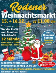 Der Rodener Weihnachtsmarkt ist mit 32 Ständen in diesem Jahr sehr gut ausgestattet, der Nikolaus hat sich für Samstag, 16 Uhr angekündigt. Unter der Schirmherrschaft von OB Peter Demmer findet auch ein Kindermalwettbewerb statt.