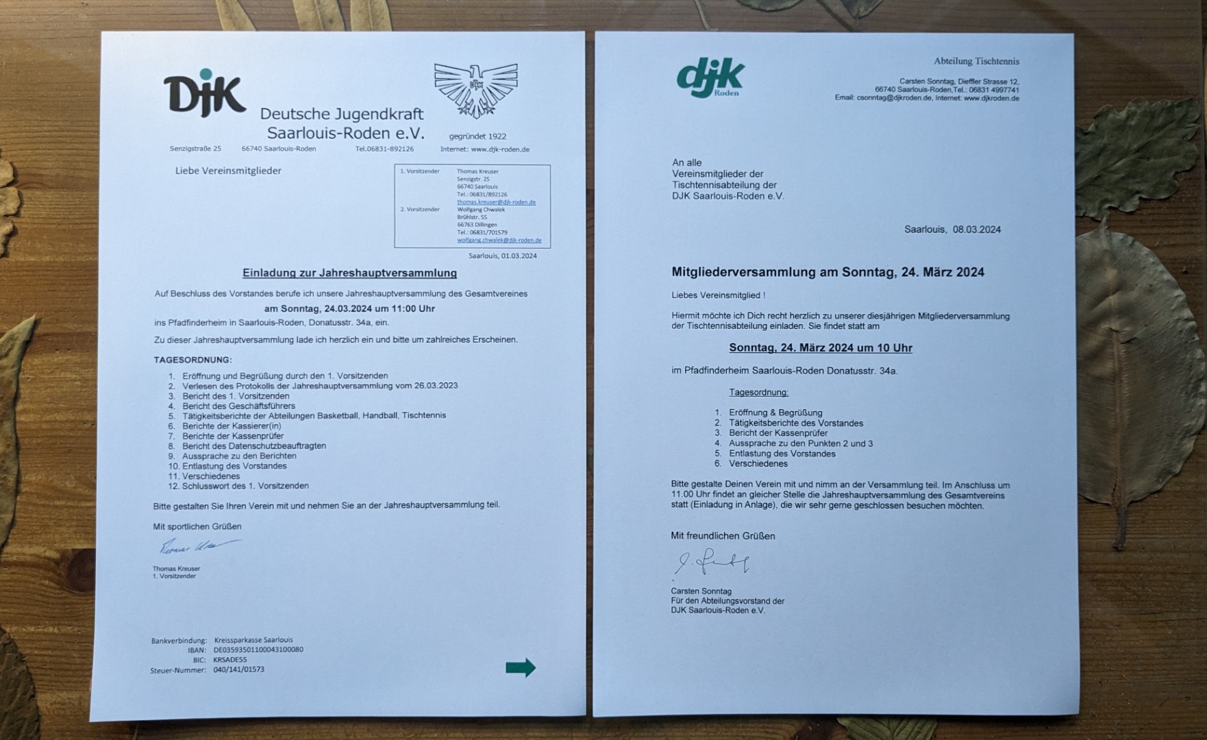 Am Sonntag, 24. März 2024 findet im Pfadfinderheim Saarlouis-Roden, Donatusstr. 34a um 10.00 Uhr die Abteilungsmitgliederversammlung Tischtennis und im Anschluss ab 11.00 Uhr die Jahreshauptversammlung des Gesamtvereins DJK Roden statt. Hier die Einladungen dazu: