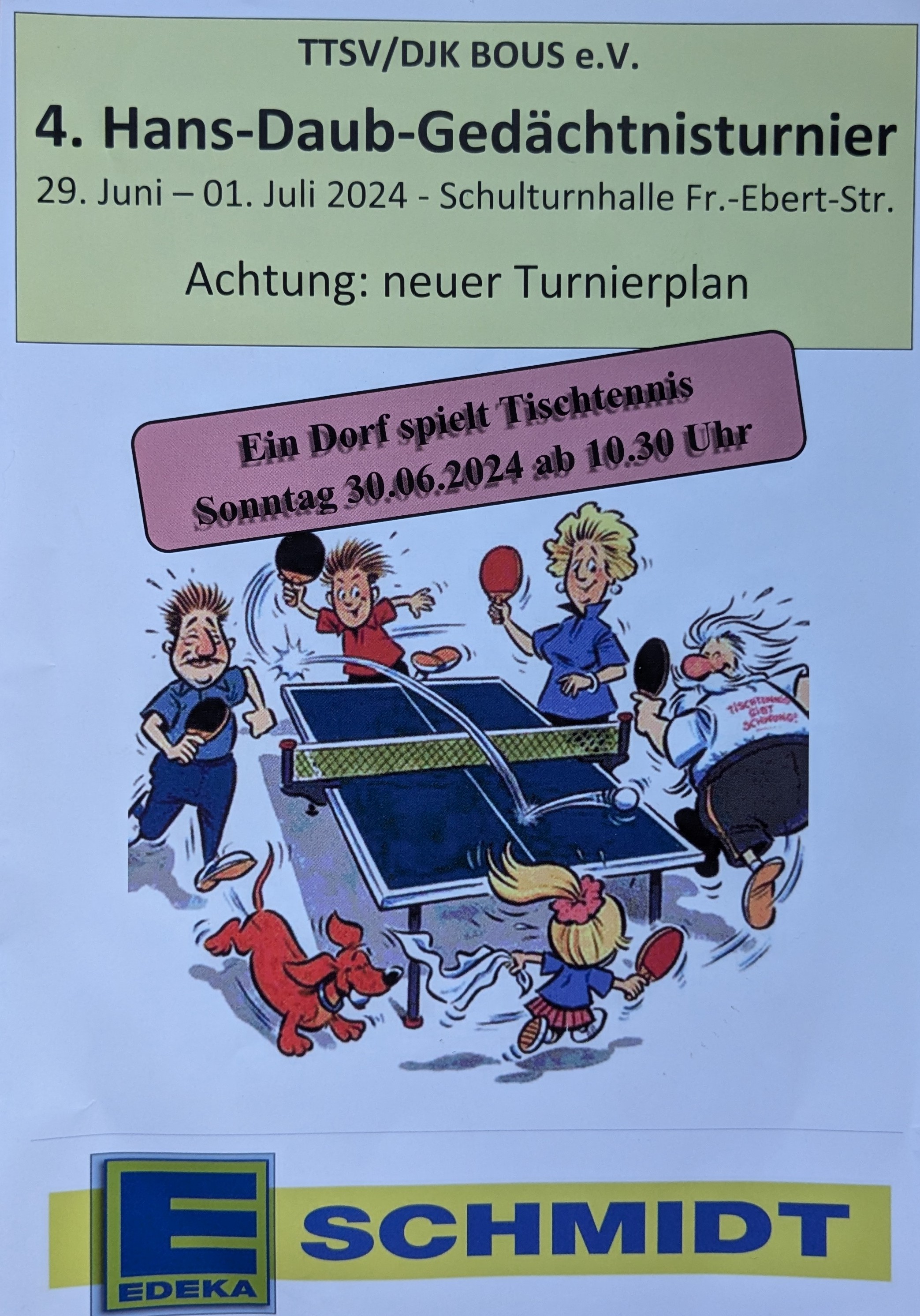 Im Gedenken an Hans Daub – Sportkamerad, langjähriger Vorsitzender und über Jahrzehnte hinweg treibende Kraft im Bouser Tischtennis – haben wir uns entschieden, das von ihm ins Leben gerufene Kirmesturnier seit 2018 unter dem Namen „Hans-Daub-Gedächtnisturnier“ durchzuführen. Im Bemühen unser Turnier für die Spieler interessant und komfortabel zu halten, haben wir in diesem Jahr den Turnierplan etwas umgestellt. Die (beiden) Aktivenklassen spielen komplett am Samstag. Ein Dorf spielt Tischtennis rückt auf den Sonntag. Die Senioren bleiben auf ihrem bewährten Platz am Montagabend.